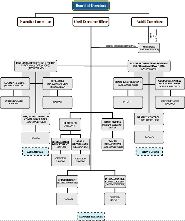 The Organizational Structure of CBSIL is typically a hierarchical arrangement of line of authority, communications, rights and duties of the different levels of employees. This structure has been formed to streamline the operations in a convenient and prompt manner.